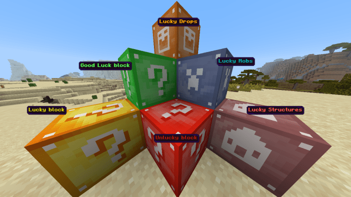包括:标准幸运方块,好运方块,厄运方块,凋零幸运方块,幸运生物方块,幸运结构方块,幸运掉落方块,幸运PVP方块